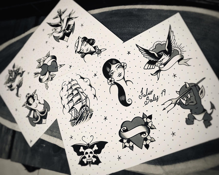 Fabio Sales é um tatuador especialista no estilo tradicional, old school. Em seu trabalho, ele usa referências de desenhos de tatuadores de 1.900, além de pintores e ilustradores do início do século XX. Sua paleta de cores é inspirada tanto em tatuadores da velha escola quanto contemporâneos, principalmente da Europa, cores que resgatam a simplicidade e funcionalidade na tatuagem. Outra característica presente em sua paleta, são o preto e o vermelho, cores com as quais busca sempre explorar o contraste e emoção proporcionados por elas.